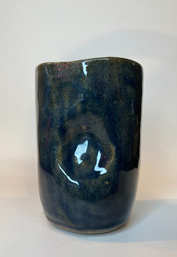 Ten ręcznie wykonany kubek zachwyca naturalną formą oraz wyjątkowym szkliwem w odcieniach głębokiego granatu z subtelnymi, złotawymi przebarwieniami. Delikatnie nieregularny kształt i miękkie wgłębienia nadają mu autentyczny, rzemieślniczy charakter, sprawiając, że każdy egzemplarz jest jedyny w swoim rodzaju.
